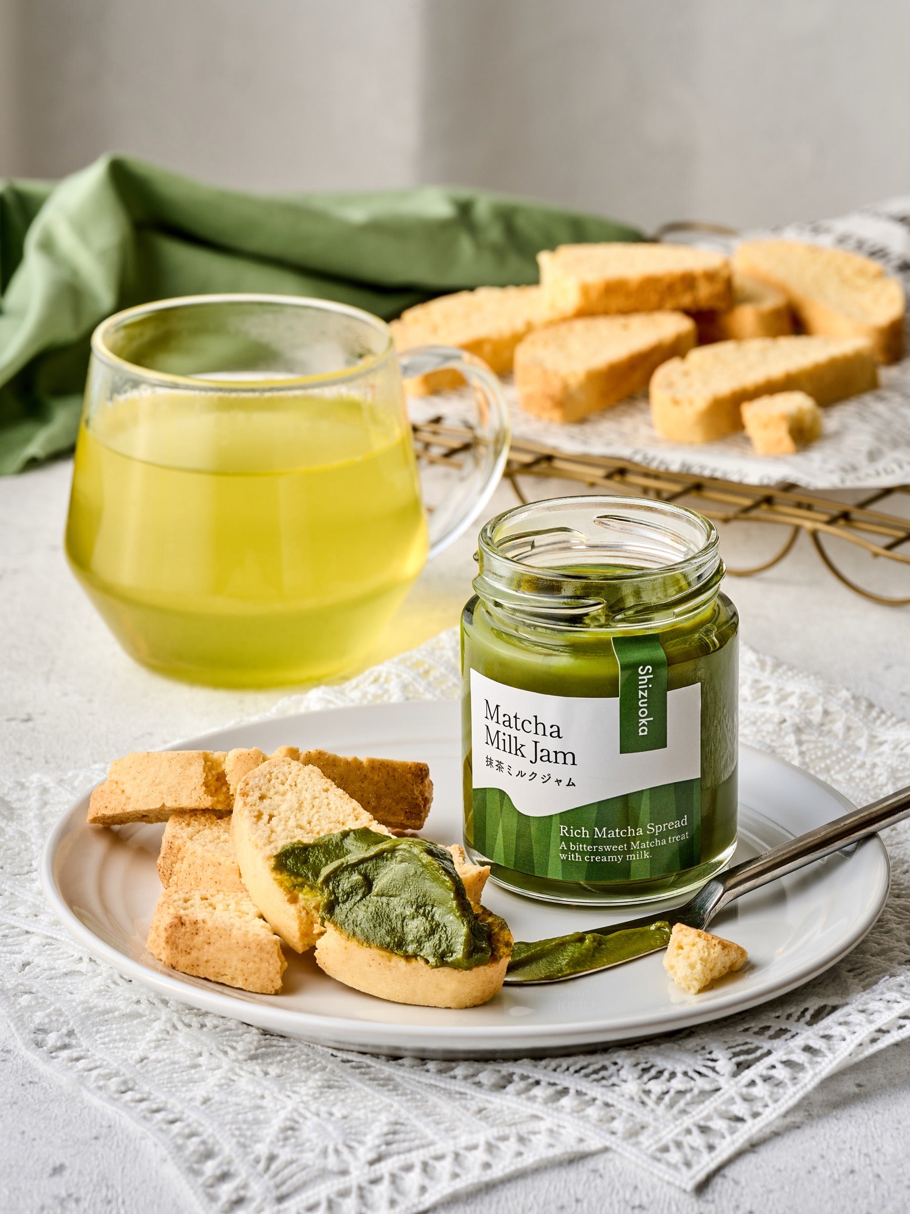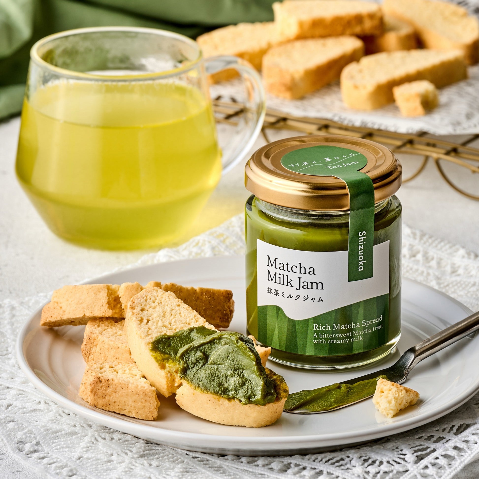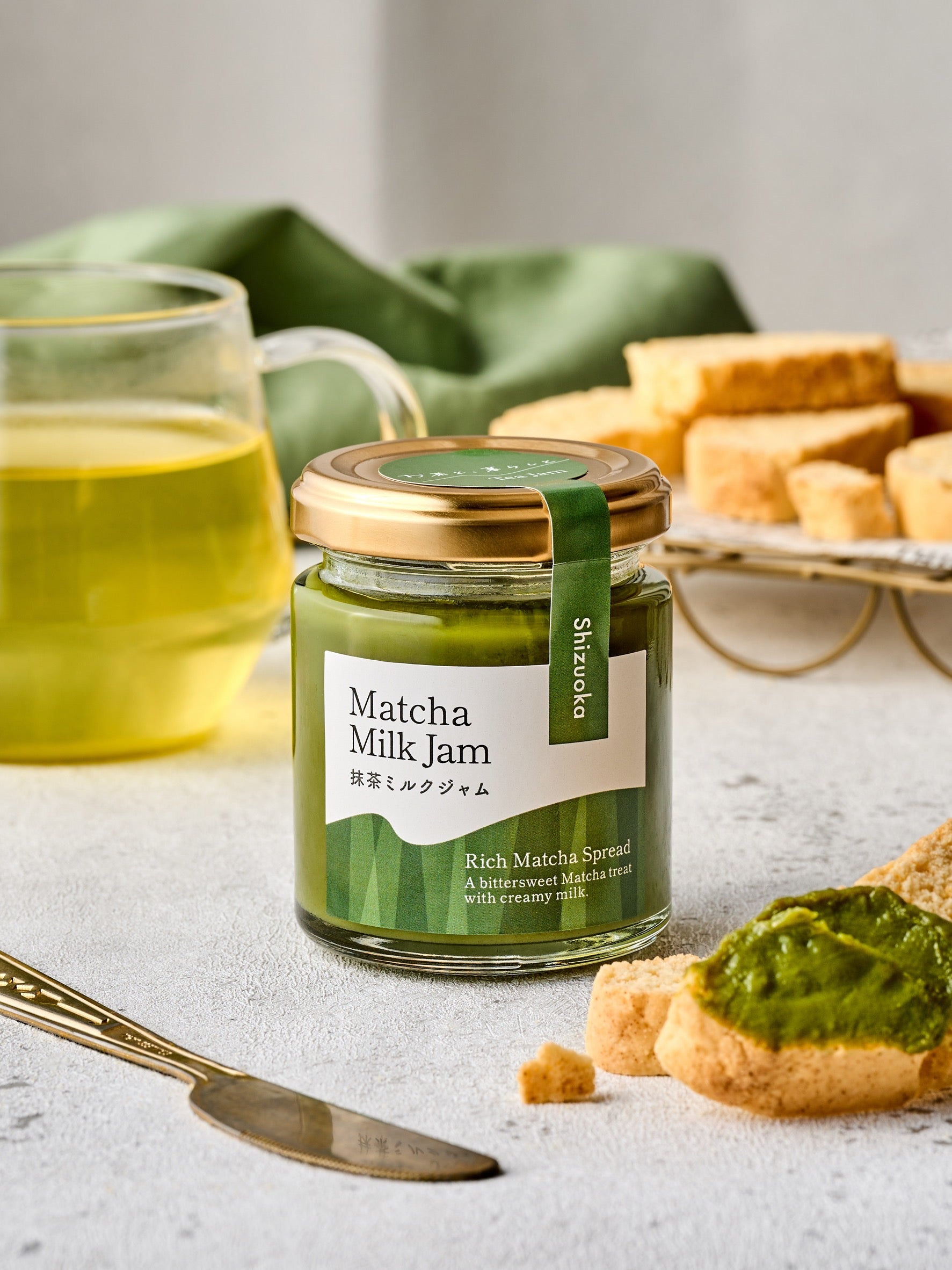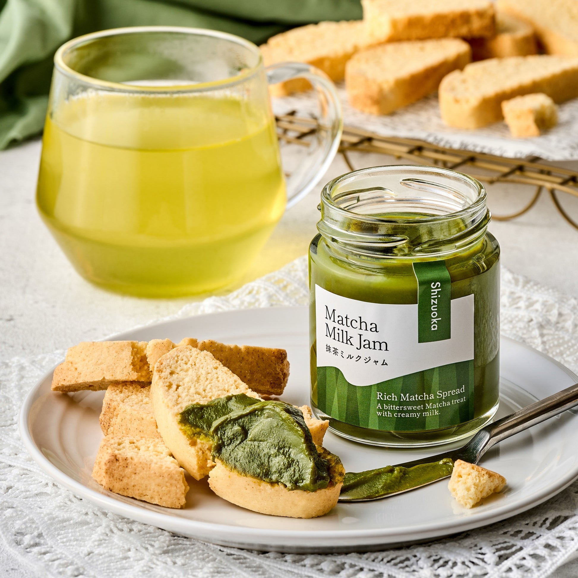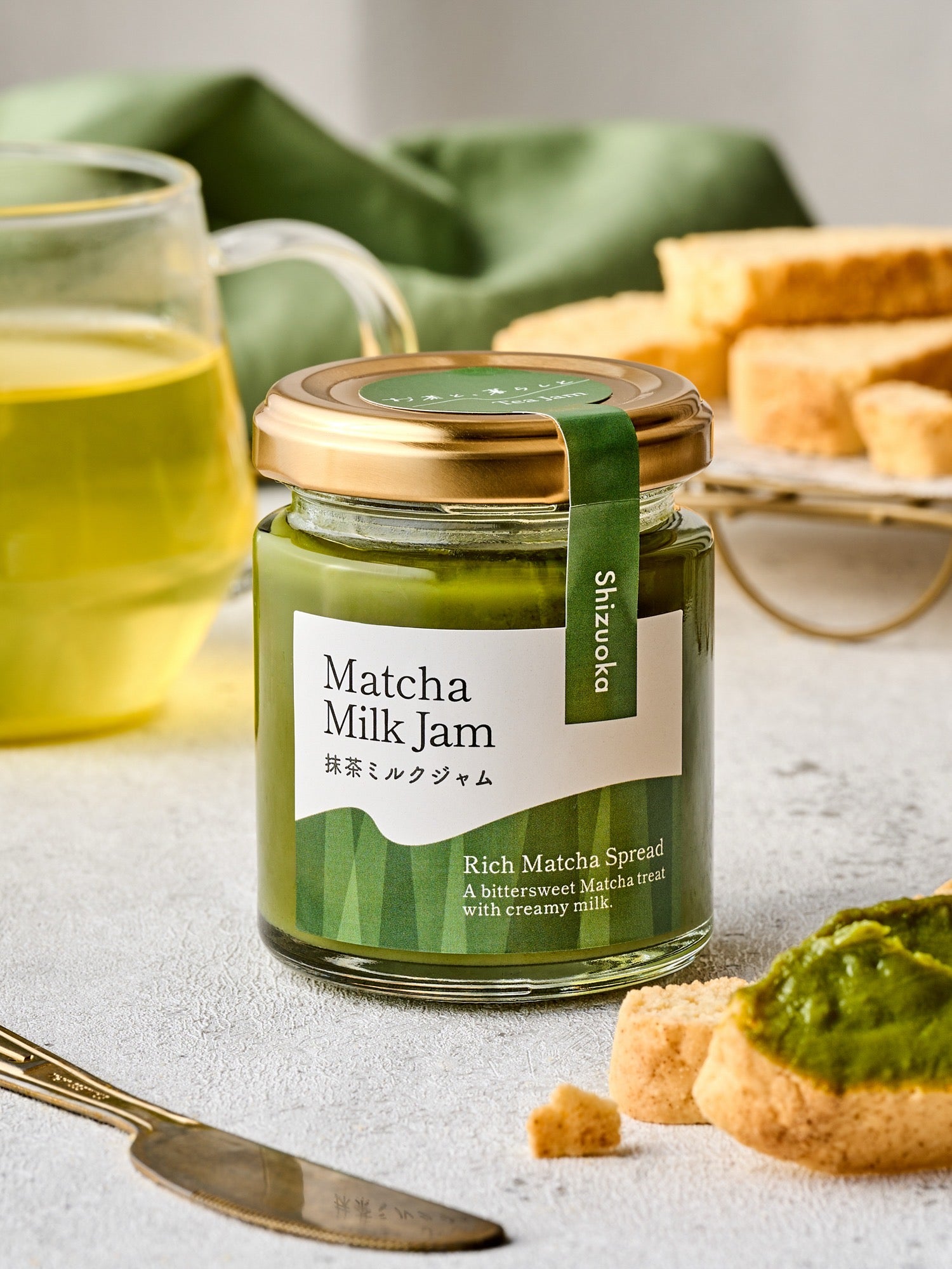 静岡の高級抹茶と粉末緑茶、牛乳、生クリーム、砂糖で作ったミルクジャム。